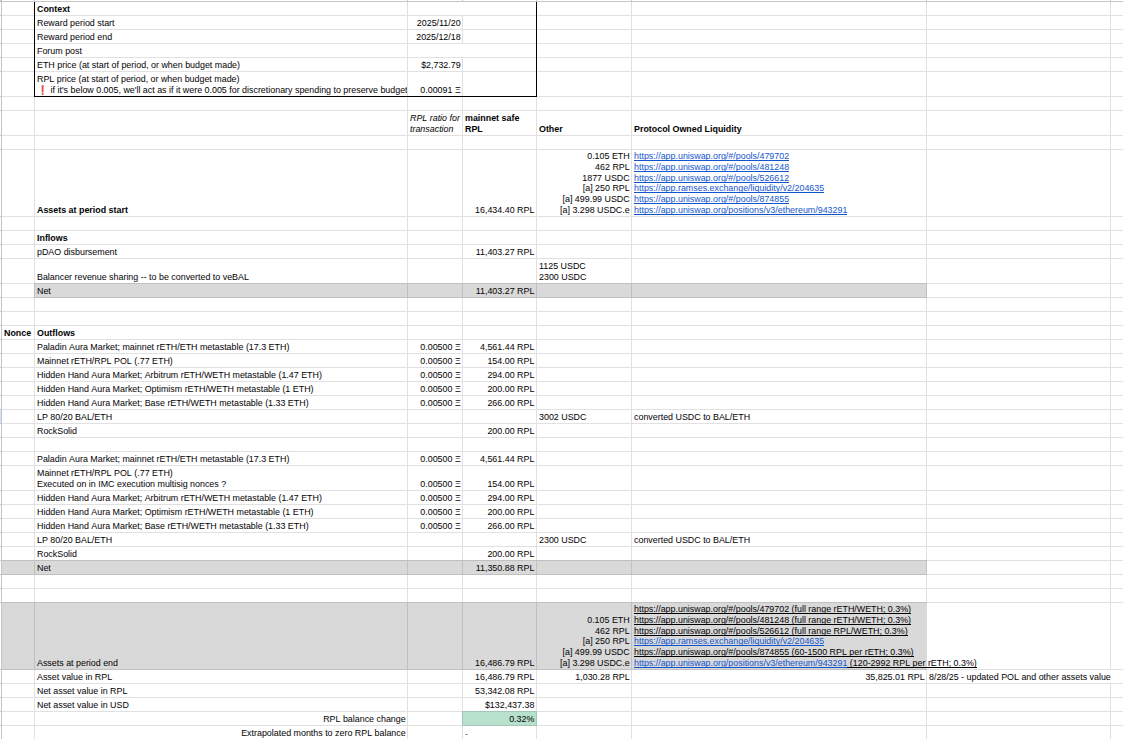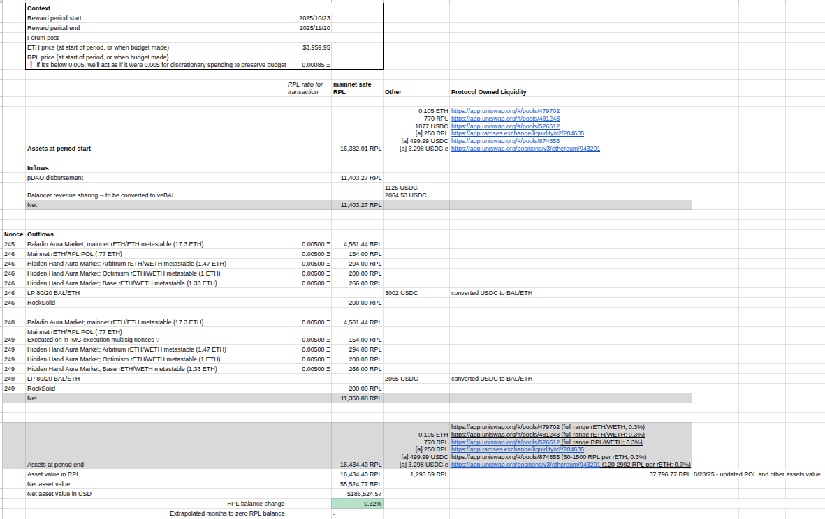 - The IMC is continuing it’s plan to roughly spend the entire inflows each period (further explanation in budget 41 here: IMC Period 40 Report; Period 41 Budget ), with an expected surplus RPL balance of 0.32% this period